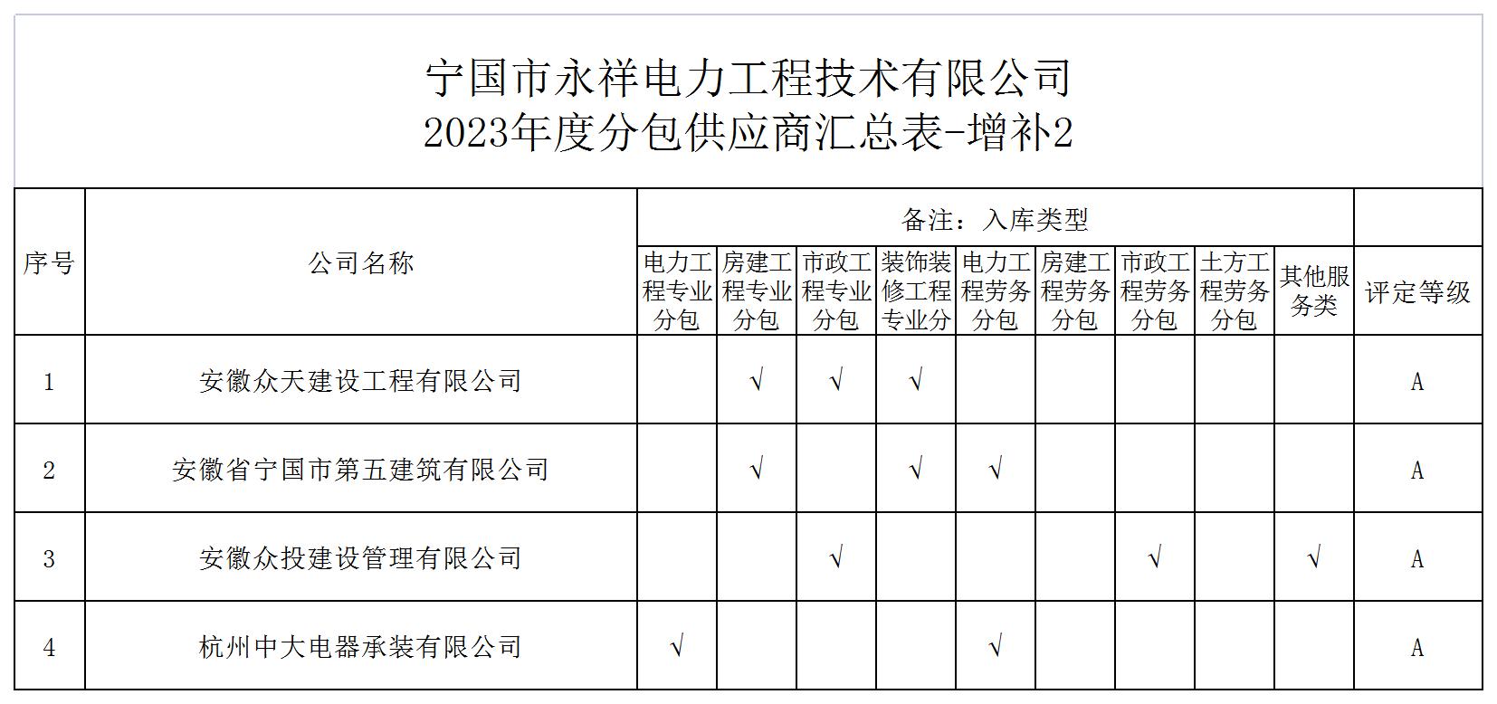 寧國(guó)市永祥電力工程技術(shù)有限公司2023年度供應(yīng)商庫(kù)入圍增補(bǔ)以下單位,現(xiàn)將入圍的候選人予以公示。